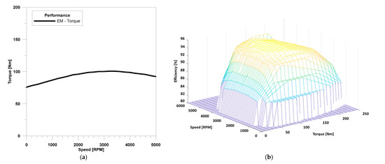 Manufacturer’s data. (a) EM maximum torque; (b) efficiency map.