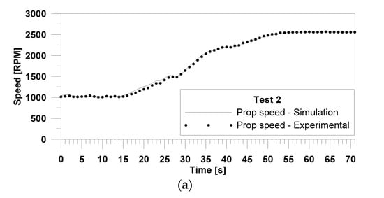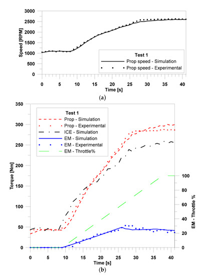 Figure 9a shows the simulated and experimental propeller speed. Figure 9b shows the propeller-simulated resistant torque, and the EM and ICE-simulated torque. Also, the experimental propeller and EM torque is shown. Table 6 compares the mean error and its standard deviation for the experimental and simulated quantities. As for the EM, only the de-fluxing functioning was taken into consideration.