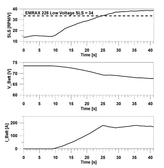 As for the latter, a dedicated model function simulates this abnormal condition, which occurs every time the ratio between the EM rotational speed and the battery voltage exceeds the EM specific load speed (SLS) value (RPM/Volt) (the EMRAX 228 Low Voltage SLS is 34). So, the model’s de-fluxing function limits the EM torque whenever that ratio exceeds the EM SLS. In this case, the EM needs extra current to perform the flux weakening of the permanent magnets. The model does not consider that current. Its calculation needs further experimental data, or a more complex model coupled with additional manufacturer’s data. However, this approximation is acceptable as this functioning is unwanted.