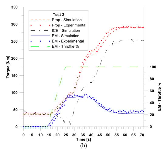 As in the previous case, the model replicated the experimental data. The model ICE throttle was handled by the PID controller and the EM throttle follows a predefined function. This function consists of three parts: