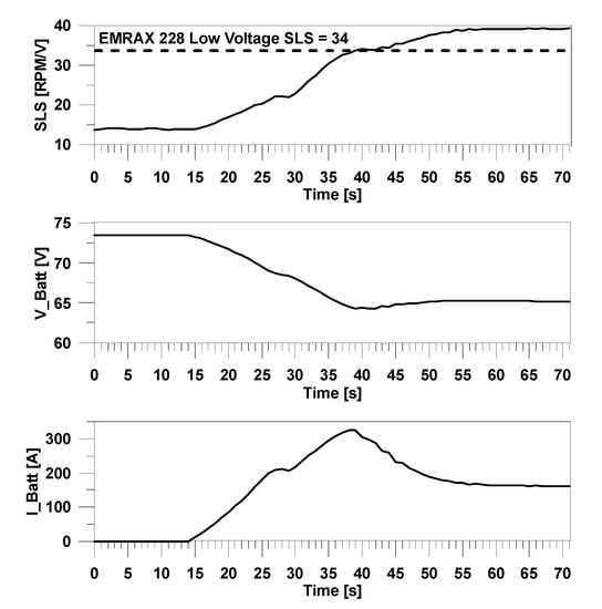 Figure 10 shows the instantaneous SLS and battery voltage and current calculated in the Test 2 simulation. In this case, the current limitation (starting from the 40th second) is even more evident than in the Test 1 simulation because the battery voltage reached a lower value.