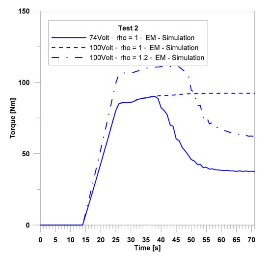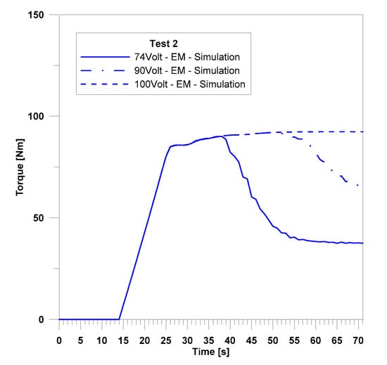 Figure 2b shows the brake and EM experimental torque curves relative to the second test (Test 2), which lasted 72 seconds and consisted of three phases.