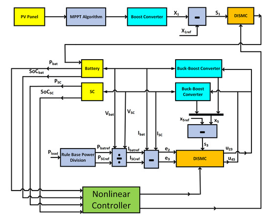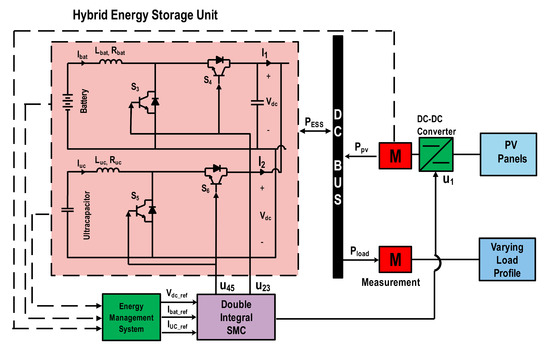 Multiple control strategies in terms of nonlinear controllers are applied to the proposed system for regulated DC bus voltage and stable operation [28,29,30,31,32]. In [13], the terminal sliding mode control (SMC) has been used for a microgrid, but the system is prone to external disturbances and has inherited chattering effects. A backstepping control method has been used in [33] but is limited to a single renewable energy source. A feedback control mechanism was proposed in [34] to attain the desired output but the system is limited to the localized stability and hence the performance of the system is degraded. In [35], a control Lyapunov function (CLF)-based nonlinear controller was proposed for a DC microgrid system but no systematic approach for ensuring power balance was performed. The optimal control schemes considering the robustness of the system are detailed in [36]. This may have an adverse effect on the system performance during the systematic shift from RESs to a hybrid energy storage system. Decentralized methods for control of DC microgrids are presented in [37,38]. The general model of DC microgrid depicted in Figure 1 consists of a PV-based generation system linked directly to a DC–DC converter and a hybrid energy storage system comprising of a battery and ultracapacitor was directly linked to the DC bus with two DC–DC converters. Here , , , , , and , represent the power, voltage, current and state of charge of the battery and ultracapacitor, respectively. and denote the nonlinear control signals. Furthermore, the state variables, sliding surfaces and errors are shown by , , and , respectively.