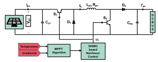 The component-wise breakdown of the DC–DC converter used for a PV system is represented in Figure 2. It comprises of two BJTs acting as a switch (), two diodes labeled as (), an inductor , input capacitor and an output filtering capacitor . The converter was assumed to be operating in continuous conduction mode (CCM). The positioning of the switches is directly dependent on the PWM signal generated by a nonlinear controller. When the switch and is at the ON state, the diode is reverse-biased and the system operates at the OFF load condition. Conversely, when both the switches are OFF, the diode is forward-biased and the system operates at the ON state and the output of the PV will be reflected across the filtering capacitor .