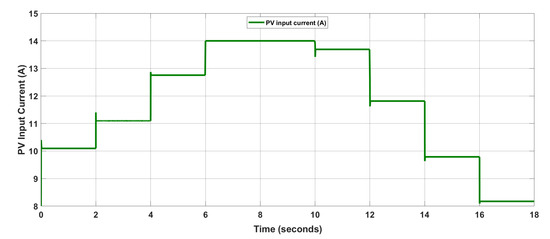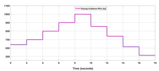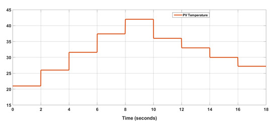 All the controller parameters must be taken to be positive to ensure the stability of the system. The proposed scheme was validated using constant and varying load profiles at regular intervals and also by varying the temperature and irradiance of the PV system. The results obtained from the simulation work consist of varying temperature, irradiance, DC load profile, voltage regulation at DC bus, current tracking, and SoC of the contributing sources and are depicted sequentially in Figure 4, Figure 5, Figure 6, Figure 7, Figure 8, Figure 9, Figure 10, Figure 11, Figure 12, Figure 13, Figure 14, Figure 15, Figure 16 and Figure 17. Moreover, to ensure the effectiveness of the proposed controller, it has been compared with SMC and Lyapunov redesign (LR). The output for the varying temperature and irradiance of the PV panel obtained using Equation (32) can be observed in Figure 4 and Figure 5 respectively. The irradiance of the system was varied from 500 to 1000 (W/m), whereas the temperature was changed from 25 C to 40 C. The current and voltage of the PV panel can be observed in Figure 6 and Figure 7. To operate the PV system at MPPT, the increase in PV voltage results in decreased PV voltage. It is worthwhile to mention that the output power generated by the PV panel falls considerably if the temperature is increased. The main objective of the controller is to regulate the output voltage at the DC link. The DC bus voltage was adjusted to 1000 V and the simulation was executed for time s. Furthermore, to observe the SoC of power sources, the Coulomb counting method was used, which is defined in the following set of equations [44]: