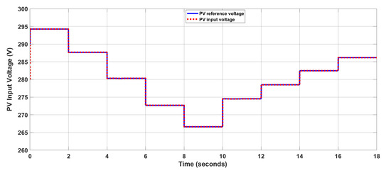 The considered PV setup consists of a PV panel and a non-inverting bidirectional buck-boost converter, as depicted in Figure 2. The converter performance is optimized by operating at maximum power point and OFF-maximum power point state as directed by the supervisory control. To obtain the reference value under maximum power point tracking (MPPT), the regression plane method utilizes the temperature and irradiance as time-varying input [39]. By using the following equation, the reference value for PV voltages can be obtained: