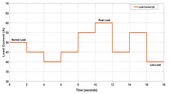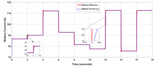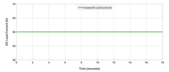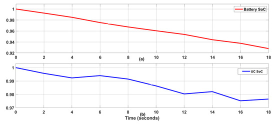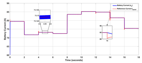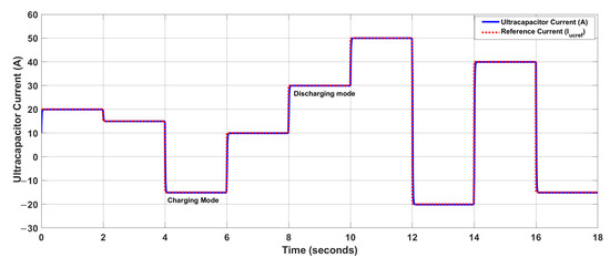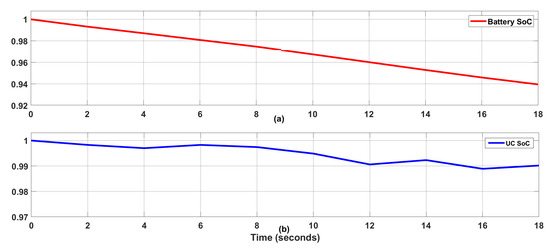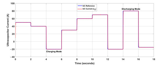 In this case, the load value is adjusted to 60 A, as depicted in Figure 8. As PV is the renewable energy source, it was operated under varying irradiance and temperature, as shown in Figure 4 and Figure 5. The output DC voltage was regulated at 1000 V using the proposed DISMC controller. For detailed analysis, the system was tested using SMC and LR controllers. It can be visualized from Figure 9 that no overshoot (OS)/undershoots (0% OS) and no chattering were observed for DISMC, whereas SMC and Lyapunov redesign reflect some regular peaks at t = 6 s and t = 12 s, with an overshoot of 9.9% and 11.4%, respectively. SMC is thought to be a good controller with finite time convergence and robust to disturbances and uncertainties but it has the inherent problem of chattering. The overshoots hence reflected are due to poor response of the controller, which can be reduced by higher-order SMC or by using a large control effort, which makes the system computationally complex and expensive. The current operating profile of a battery and UC in Figure 10 and Figure 11 shows that both the rechargeable sources are operated within the specified limit of operation, ensuring perfect reference tracking. It is clear from the figure that UC caters for the transient load, whereas the battery is operated under normal load conditions to ensure an extended life. From t = 6–12 s, power from the PV source falls, resulting in an increased stress on the hybrid energy storage system. As UC is the auxiliary source, it caters for the transient and hence limits the operation of the battery to have an extended life cycle. In addition, when sufficient power from the renewable energy source was included, the stress from the hybrid energy storage system reduced significantly. Finally, the SoC of battery and UC is depicted in Figure 12a,b, which is in exact accordance with the charge–discharge cycle of the energy storage elements.