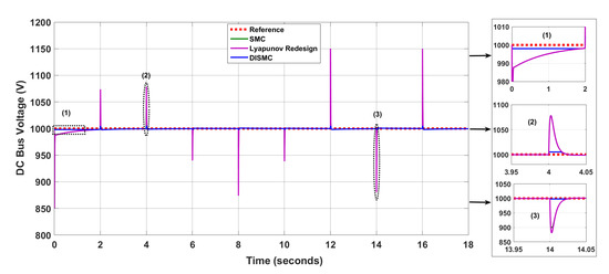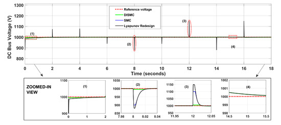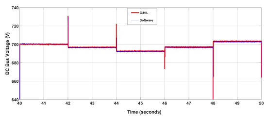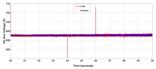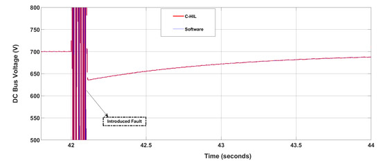 Furthermore, in Figure 21, the robustness of the proposed DISMC controller was observed by introducing a fault for 0.1 s, falling in the time interval of t = 42 s to t = 42.1 s in the DC microgrid system. It is worthwhile to mention that the proposed control scheme is efficient enough to overcome the introduced fault within a minimum time of 1.5 s and regulates the DC bus voltage to a reference value of 700 V instantly. The fault introduced in the system has been removed by using the robust response of the proposed DISMC controller. The double-integral action and the signum function present in the SMC controller help deal with the introduced fault. When the reference value is changed due to a fault, the controller brings the value back to the original value of 700 V to minimize the steady-state error and to ensure asymptotic stability of the system. The proposed controller would be able to cater to all the uncertainties and disturbances within the certain bounds such that the asymptotic stability of the system is ensured. The results obtained from the C-HIL setup guarantee the effectiveness of the proposed DISMC controller.