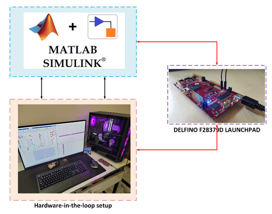 To ensure the effective response of the proposed DISMC controller, it is compared against some standardized control techniques, such as SMC and Lyapunov redesign. Figure 14 shows the visual representation of the DC bus voltage for the proposed control scheme in comparison to others presented in the literature. A detailed analysis is presented in Table 5 for different control strategies to observe the performance parameters, which are rise time, settling time, overshoot (OS), and steady-state error (SSE). It is pertinent to mention that for voltage regulation at the DC bus; the rise time of the proposed controller is t = 0.00015 s, whereas for SMC, t = 0.04 s, and for Lyapunov-based control, t = 0.0026 s. Moreover, the settling time for SMC is quite impressive with t = 0.0002 s, for DISMC t = 0.00007 s and for Lyapunov-based control, t = 0.1 s. In addition, at t = 12 s, (Figure 14) an impressive response of the DISMC controller is observed in terms of OS and SSE due to the presence of double-integral action, resulting in 0% OS and reduced steady-state error. In contrast for SMC, an OS of 9.9% and a SSE of 0.007%. A significant OS 11.4% and a SSE of 0.02% for Lyapunov control due to the integration of a renwable energy source. Figure 14, shows a remarkable reduction in the chattering of DC bus voltage regulation due to double-integral action in DISMC, as compared to SMC and Lyapunov redesign control. It is worthwhile to mention that the proposed controller has an effectrive response in comparison to other controllers with minimum rise time, SSE and zero OS. Now, to ensure the real-time applicability of the proposed controller, it was tested using a hardware-in-the-loop test bench.