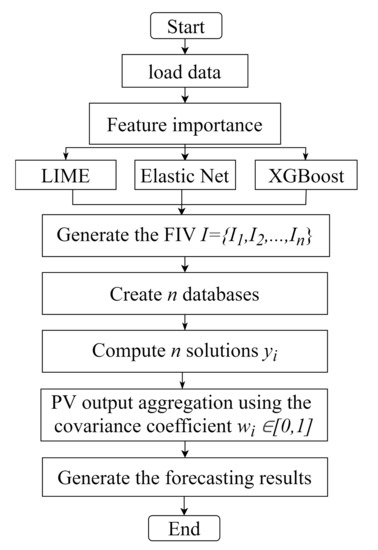 The importance of an input depends on whether the forecasting performance varies dramatically when such input is replaced with random noise [59]. Thus, the selection of the best features or the best combination of features has an utmost importance on the prediction model performance. The proposed methodology consists of introducing a preprocessing approach based on the p-value information associated with the RF model. For variable importance quantification, the p-value is designed to measure the feature relevance using Gini index (impurity). For every input parameter, the p-value is measured according to three feature ranking techniques: Elastic Net, Local Interpretable Model-agnostic Explanations (LIME), and Extreme Gradient Boosting (XGBoost). The Feature Vector Importance (FVI) is unified for each method to fairly grasp the non-linear relationships among candidate attributes and assess interactions to showcase the most effective combination of features. The global FVI is concluded using the average FVI methods output. Afterward, with every elimination of one feature, RF model generates an output result using the rest of the data. Then, a voted ensemble technique makes a multiscale prediction for input vectors and multiply the probability distribution by the FVI. This perfectly tailored forecasting system assumes that the RF acquires n features. The prediction system is divided into n subsystems. For each subsystem, a k feature parameter is eliminated from the database. With the Bagging model, every subsystem gives a prediction output y ¯ i . Let us make w i [ 0 , 1 ] d be the importance rate of each feature. The final output is concluded by summing the weighted subsystems products by an importance factor explained in: