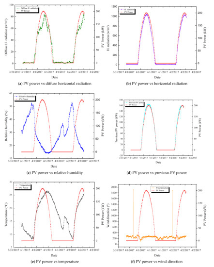 Figure 6. PV power time series with the related feature inputs: (a) diffuse horizontal radiation (b) horizontal radiation (c) relative humidity (d) previous PV power (e) temperature (f) wind direction.
