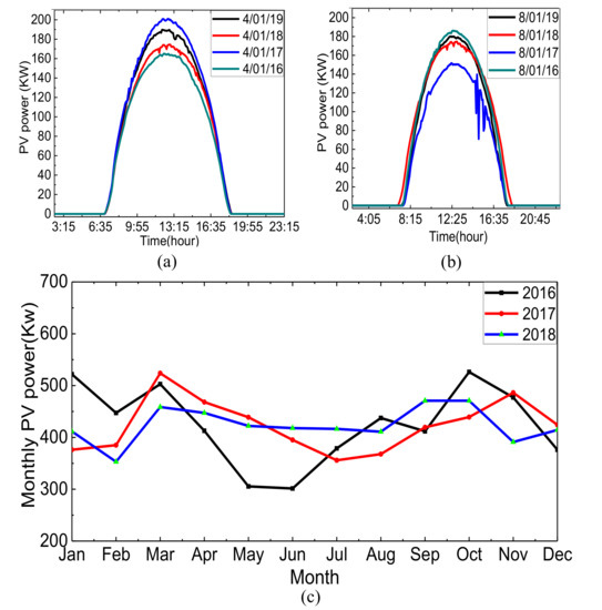 Figure 7. PV power variation (a) on April 1st in the past 4 years (b) on August 1st in the past 4 years (c) between 2016–2018.