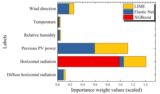 The proportional importance distribution is not uniformly partitioned, as shown in Figure 8. For instance, XGBoost only considers the horizontal radiation as an informative feature while the Elastic Net does not attribute high p-value to Horizontal radiation. On the contrary, LIME gives the most physically comprehensive results. The yearly lagged PV power and horizontal radiation are the most correlated features with the current PV power. Each feature is given a relevant weight value w i with i = 1 n w i = 1 . The weights calculation takes into consideration the inputs permutation, and the percentage of the error caused by the exclusion of the corresponding feature. The higher p-value reflects, the closer the behavior of a feature inputs to the output predicted.