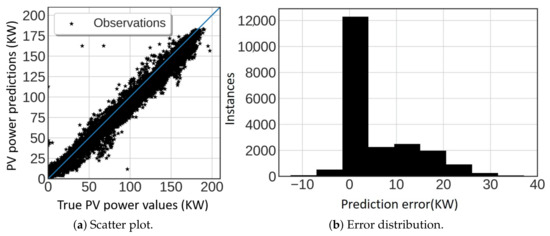 Figure 11. Scatter plots (a) and error distributions (b) of PV measured power and forecasted power.