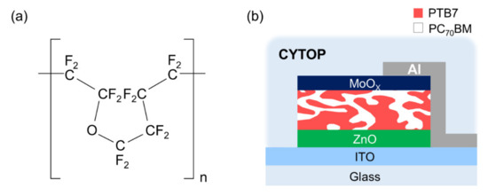 Among various solution-processable candidates, the hydrophobic polymer CYTOP has been pointed out to significantly enhance the stability of optoelectronic devices [29,30,31]. In brief, CYTOP is a fluoropolymer (Figure 1a) of which the hydrofluoric surface is effective for repelling moisture [29,32,33,34], and moisture is a representative aging factor in organic devices [12]. For example, Granstrom, J. et al. reported that a CYTOP-encapsulated organic light-emitting diode (OLED) showed minor degradation after immersion in water for 2 min, while bare devices without CYTOP layers were totally degraded [29]. Similarly, Kim, J. M. et al. revealed that CYTOP encapsulation provided strong water resistance for pentacene-based organic thin-film transistors (OTFTs), resulting in negligible change of OTFT characteristics with a drop of water placed on the channel [32]. Although a few articles have reported the encapsulation functioning of CYTOP for solar cells [30,31], a comprehensive analysis of the effect of the CYTOP encapsulation on OSCs’ shelf lifetime with detailed diode characteristics and impedance spectroscopy has not been conducted. Hence, the comprehensive study of the CYTOP encapsulation layer in OSCs would provide valuable insights for designing reliable OSCs.