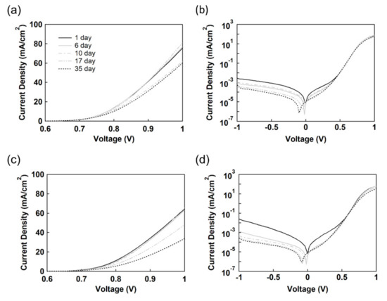 Linear and logarithmic current density–voltage (J–V) characteristics without the illumination of (a,b) CYTOP-encapsulated and (c,d) bare devices without illumination. Solid and dashed lines are the respective J–V characteristics of day 1 and day 35, where the grey lines are the curve of days between them.