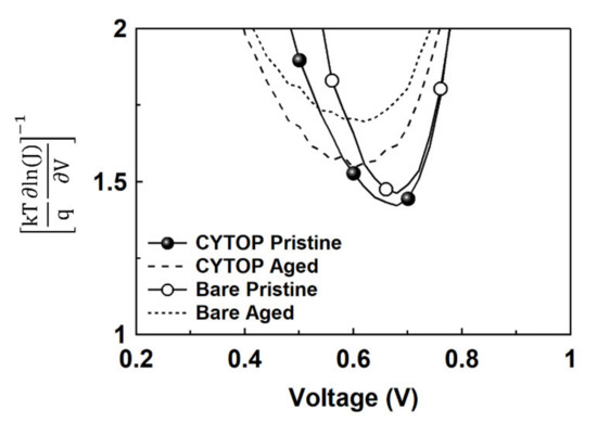 where k is the Boltzmann constant, T is the absolute temperature in Kelvin, J is the current density, and V is the voltage. In Figure 5, the pristine ideality factor (n) of bare and CYTOP-encapsulated devices showed almost similar values of 1.46 and 1.42, respectively. After degradation, the ideality factor (n) of the bare device increased from 1.46 to 1.70, while the ideality factor (n) of CYTOP-encapsulated devices slightly changed (from 1.42 to 1.55). The changed ideality factor (n) after the aging test indicates that trap-assisted recombination loss becomes more dominant in the bare device compared to its initial state. As a result, more photo-generated carriers might be annihilated at the trap sites during their transport to the electrode in the bare devices after the aging test. On the other hand, the recombination process of charges is relatively maintained in the CYTOP-encapsulated OSCs, leading to slightly changed diode characteristics after the aging test. Therefore, it can be interpreted that the stable performance (Figure 3) and J–V characteristics (Figure 4) of CYTOP-encapsulated OSCs are highly related to the different degrees of change in the ideality factor (n) upon degradation, implying the excellent moisture barrier impact of CYTOP.