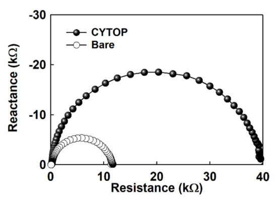 Cole–Cole plots of CYTOP-encapsulated and bare OSCs after 35-day shelf aging, measured by impedance spectroscopy in dark conditions.