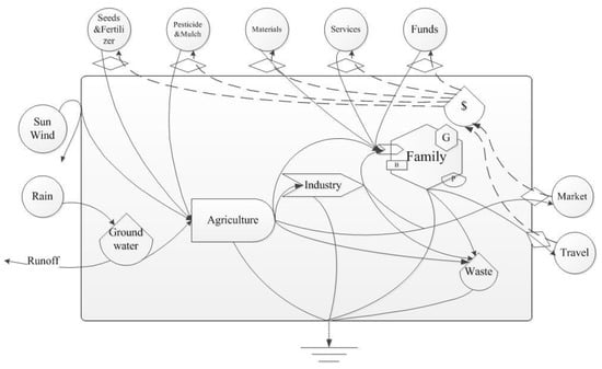 Emergy flows of a rural ecosystem. Note: B, business; P, people; G, government; $, dollar.
