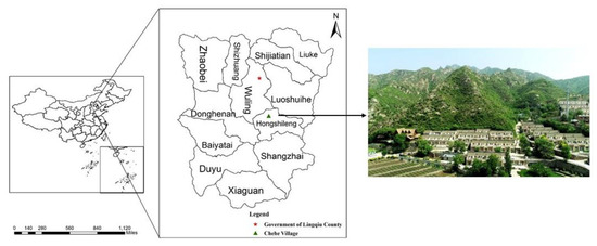 Location of Chehe Village. Note: the first picture in the left is the map of China, the second picture is the map of Lingqiu County, and the third picture is the view of Chehe Village. The location picture of Chehe Village was drawn with Arcgis by the author and the right view picture of Chehe Village is from the website. Website address is http://k.sina.com.cn/article_6433760072_17f7b634800100ot6r.html?wm=3049_0032 (accessed on 18 May 2020).