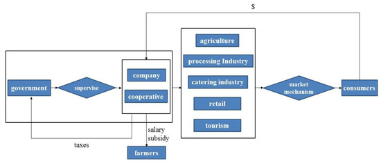 Chehe Organic Farming Community, with 1213 acres of arable land, including organic corn, organic rice and organic potatoes, were managed by the company. In addition, 30,000 chickens and 5000 sheep were raised. Leisure and tourism facilities, such as Mengyou valley, open-air cinema, sky bike and rock climbing, attracted people from the city to take leisure vacations and carry out outdoor sports. At the same time, the catering industry, sales industry, homestay industry, and the leisure tourism industry complement each other, and bring huge benefits to local villagers. In general, Chehe Organic Agriculture Community is a demonstration village integrating agriculture, agricultural product processing industry, catering industry, retail industry, and leisure tourism industry. Under the supervision of the government and the unified management of the company and cooperatives, Chehe Village employed village labors, subsidies for land transfer, and distributes company dividends to increase farmers’ income (RMB 18,500 per capita in 2019, and RMB 5096 per capita in 2012), attracting migrant workers back to the village. The operation mode (Figure 3) has been widely publicized and reported and has become a typical case of poverty alleviation in China.