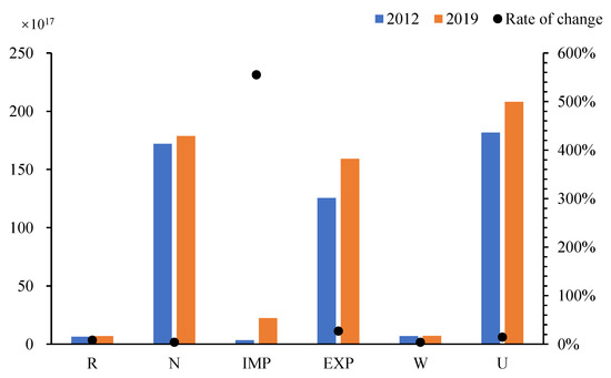 The emergy of the renewable resources achieved 6.95 × 1017 sej (2019) of Chehe Village, which was 8.22% higher than 2012 (Figure 4). Moreover, we only calculated the largest renewable flow between the sun, wind, and rain to avoid double accounting [39]. There were no large-scale industries in the Chehe Village due to the ban of coal mining since 2011, and thus, the amount of non-renewable resources was relatively low. Non-renewable resources in 2019 (1.79 × 1019 sej) increased by 3.99% compared to 2012 (1.72 × 1019 sej), mainly because the electricity usage had increased with population increase. Imported resources increased exponentially (from 3.40 × 1017 sej in 2012 to 2.23 × 1018 sej in 2019) mainly because the government and enterprises had unified management of Chehe Village in 2019. They invested a lot of money in poverty alleviation and rural revitalization measures such as built bulletin board, party building funding, harmless toilet, education input, and others (Appendix A). In addition, tourism was also a new type of industry in the construction and development of agricultural parks, and there was no such income in 2012. Natural gas, as a clean energy replaced coal, was much more environmentally friendly [51]. However, there were no pesticide and mulch in 2019, which protected the condition of agroecosystem and the village environment [52,53]. Export resources increased 26.90% from 1.25 × 1019 sej in 2012 to 1.59 × 1019 sej in 2019, which was mainly due to the amount of exporting products increasing. After the establishment of organic farming in 2013, Chehe produced organic eggs, grew morels, and lucid Ganoderma in the greenhouse, which were important resources for Chehe Village to export to other places. Finally, the waste flow remained basically unchanged, with 6.82 × 1017 sej in 2012 and 7.09 × 1017 sej in 2019.