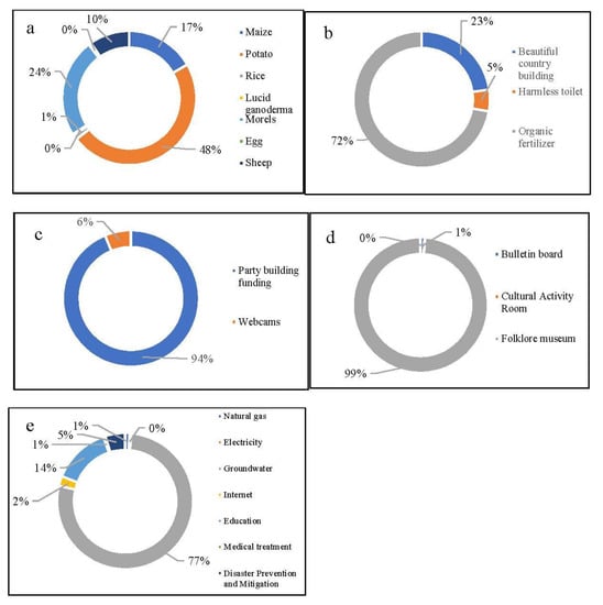 Structural analysis of rural revitalization of Chehe Village. Note: the subfigures is the proportion of items included in each part, (a) is the industrial economy; (b) is the ecologically livable; (c) is the rural governance; (d) is the social civilization; (e) is the rich life.