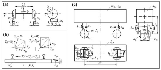 2-axle vehicle model: (a) Track vertically, (b) track laterally, (c) vehicle.