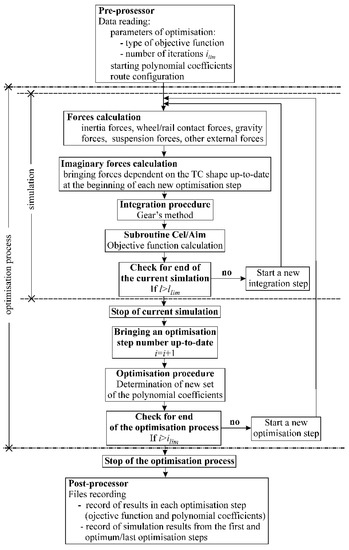 The scheme of the software is presented in Figure 4. There are two iteration loops. The first one is the integration loop. It stopped when the assumed length of the route is reached by the vehicle model. The second loop is the optimization process loop. This loop stopped when the limit assumed value of iteration is reached unless the optimum solution is not found earlier. In practice, 200 iterations were enough to find optimum solutions. The typical time of calculation was not greater than 1 h for each optimization, using Intel Core Duo 2 GB processor.