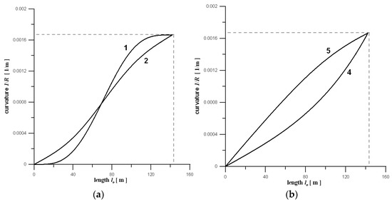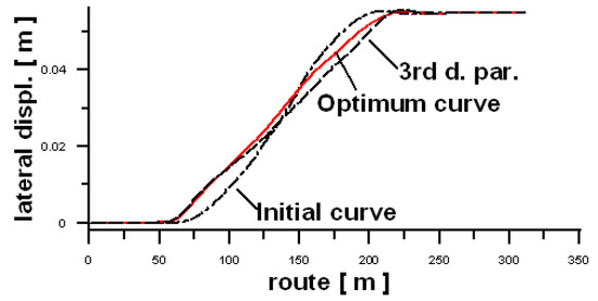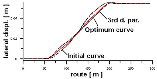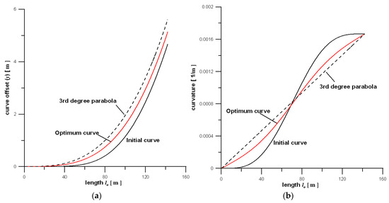 Graphical results are limited to the case no. 2 from Table 2. Figure 6a shows a comparison of transition curves (curve offsets y)—initial one (black line), optimum one (red line), and the 3rd degree parabola (dashed line), whereas Figure 6b shows their curvatures. It can be seen that both the offset, and the curvature of the optimum curve places it between the standard curve and the 3rd degree parabola. It is also visible that the curvature of the optimum curve is something between the standard curve and 3rd degree parabola.