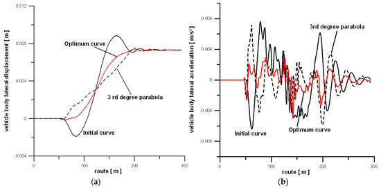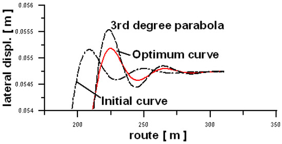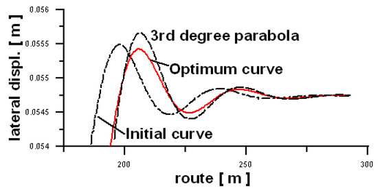 Figure 7 shows the comparison of the lateral displacement and acceleration of the center of mass of the car body for the initial curve, the optimum curve, and also the 3rd degree parabola. Both the displacement graph (Figure 7a) and the acceleration graph (Figure 7b) clearly show that the optimum curve is better than both the standard curve, and the 3rd degree parabola. Notably, in this context, interesting is Figure 7b for accelerations.