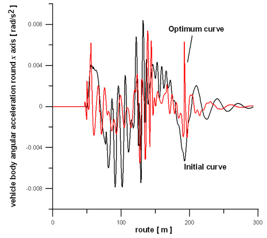 Figure 8 presents the comparison of other graphical results—here, the lateral acceleration of the car body around the x-axis for the initial (standard) curve of 9th degree and the optimum curve. The betterment of rail vehicle dynamics is visible in comparison to the standard curve of 9th degree.