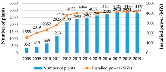 In terms of the installed nominal power capacities, the distribution of the plants showed that most of them have installed power capacities up to 1000 kW (Table 2). This is due to the eco-incentive tariff that was enforced from 2008 until 2012, which provided an all-inclusive tariff of 0.28 €/kWh undifferentiated for ABPs up to 999 kW [61].