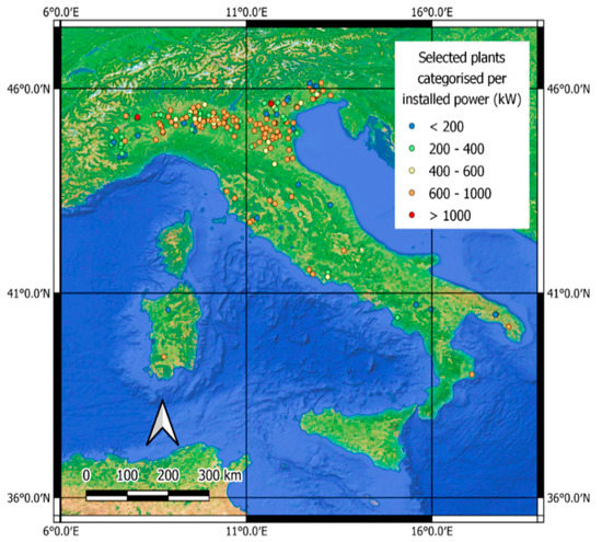 A random sampling selection was applied to the available dataset. Through this technique, of the 1939 biogas plants, a significant set of 200 Italian ABPs were selected and constituted the sample for this analysis. These digesters were selected randomly while respecting the distributional proportions of the plants in Italy to obtain a representative result of the actual situation with which to perform the desired analyses and to obtain conclusions with the lowest possible biases. In this work, ABPs with various powers were sampled, ranging in power capacity from 60 kW to 1156 kW (Figure 2). The biogas plants are represented with their installed power. Most of the ABPs are in northern Italy, and the distribution of the sampled plants is consistent with that of the entire sample; intensive agricultural activities are practised more intensively in these regions because there is a higher availability of resources for bioenergy production.