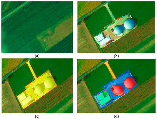 Before (a) and after (b) situation of a soil surface converted from agricultural cultivation land into a plant for anaerobic digestion with the scheme of the built structures. The total area occupied by the plant (c); the land surface occupied by digester structures (red), storage surfaces (green), new roads (orange), and other structures and remaining areas (blue) (d).