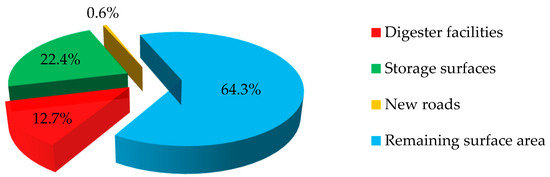 On average, 64.3% of the covered surface area is free from any facility dedicated to anaerobic digestion. For 24 of the studied biogas plants, this percentage is above 75%, and for 18 of them, up to 2 hectares are allocated in this manner. These values demonstrate how crucial the proper planning of inner traffic circulation in biogas plants is for reducing soil sealing. The remaining 35.7% of the area is divided between areas occupied by the plant and areas dedicated to storage systems. The latter category occupies more than one-fifth of the total area because of the large volume of biomass that must be stored to allow the continuous and efficient operation of the anaerobic digestion process. In 58 ABPs, the surfaces occupied for storage exceed 5000 m2. This value highlights the importance of an efficient supply of feedstock. The digester, the main element of each complex, occupies, on average, together with the technical installations, a relatively small portion of the total space, covering up to 0.5 ha only in 7 sampled plants. The surfaces converted from agricultural areas to new roads compose the remaining 0.6%. Only in 16 cases were new roads asphalted from scratch; all the other systems were installed in easily accessible areas thanks to existing roads.