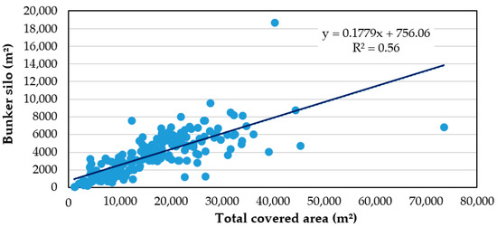 The relationship between the total surface areas and the areas intended for storage was also studied (Figure 6). On average, storage areas occupy 22.4% of the total surface area; the determination index was R2 = 0.56 and the p-value < 0.0001, attesting to the high correlation between the two variables. Only in 33 plants did the area dedicated to the storage surface exceed 30% of the overall surface area, and in 11 cases, the storage surface area was less than 10% of the total covered area.