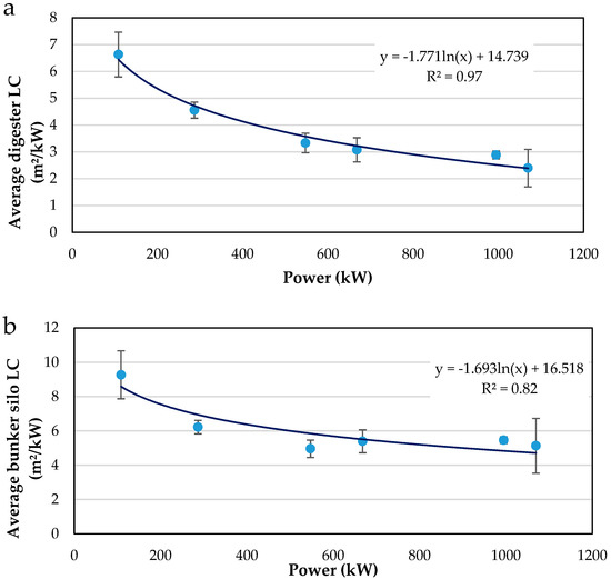 Relation between installed power and average digester LC (a) and average bunker silo LC (b).