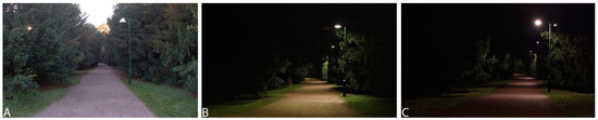 Figure 1. Pedestrian path during the day (A) and at night, for lighting application I (B) and II (C) (ISO 100, f/4, exposure time 1.3 s).