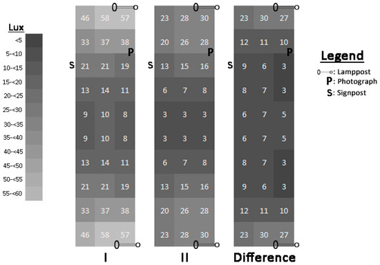 On the right-hand side of the path, lampposts were placed at intervals of 21.5 m, with luminaires at a height of 4 m. Two LED lighting applications were used in the study: lighting application I (CCT: 3060, Colour Rendering Index, CRI: 74, Scotopic/Photopic ratio, S/P: 1.25) and II (CCT: 3028, CRI: 80, S/P: 1.28) (for photometric data, see Table 2). The lighting applications were selected by the municipality of Malmö on the basis of economic feasibility, fulfilment of technical specifications according to the national standards and relevance for use on pedestrian paths in the city. To attain greater ecological validity, the most common CCT (3000 K) for outdoor use in Malmö was used. The horizontal illuminance on the path varied between 3 and 58 lx (lighting application I, E H : 10–58 lx, E ¯ H: 26 lx; lighting application II, E H : 3–29 lx, E ¯ H: 15 lx) with the corresponding uniformities U I   = 0.38 and U I I   = 0.20 (Figure 2).