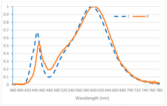 Figure 3. Normalised SPD for lighting applications I and II. Relative power is depicted on the y-axis and wavelength on the x-axis.
