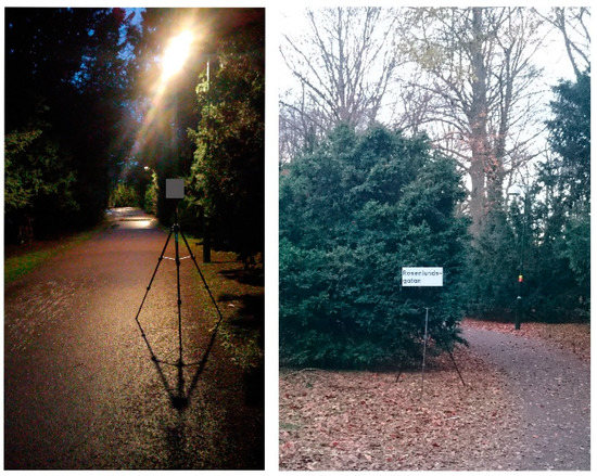 To evaluate whether differences between the lighting applications affected the visual accessibility of the environment, two tasks were administered: facial expression recognition and sign reading (Figure 4). Facial recognition is deemed an important visual task for pedestrians after dark, since judging the intent of oncoming pedestrians from a safe distance is thought to influence the perception of safety [66,67,76,77]. In the facial expression recognition task, the participants were instructed to walk along the path towards a photograph of a woman’s face (175 × 200 mm; positioned at a height of 1.65 m; printed on non-glossy paper), placed on the right-hand side of the path 17.5 m from the first lamppost. The participants were instructed to stop when they could discern the facial expression of the woman (the expression was anger (p. 127), from the Emotions Revealed photo set [78]). They were then asked to give a verbal statement of the perceived emotion.