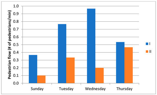 For the behaviour measure, observations of pedestrian flow, there was no significant difference between the lighting applications (U = 1, p = 0.057, r = −0.71) (Table 4). However, the effect size of −0.71 indicates a large effect, and the non-significant result may be a type II error, due to the limited number of observations (N = 8). As seen in Figure 5, the pedestrian flow on the path was quite low for both lighting applications (I: Mdn = 0.65; II: Mdn = 0.27 pedestrians/min).