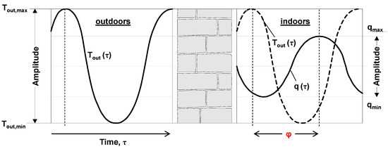 The phase shift ϕ is the time lag between the peak outdoor temperature and the peak heat flux transferred indoors under dynamic conditions (Figure 2). Walls with excellent dynamic thermal performance have a high phase shift (ϕ > 12 h), whereas ϕ < 6 h means poor dynamic thermal performance. A recent study suggested that phase shift is the most relevant dynamic thermal parameter, and that, in hot regions of Spain, ϕ > 15 h should be achieved: in this case, the thermal transmittance U is not the most relevant factor in the thermal design of a wall [26].