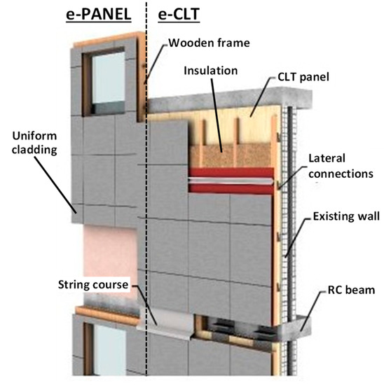The e-SAFE envelope renovation concept, with a combination of e-PANEL and e-CLT: in non-seismic countries, only e-PANEL is applied (elaborated from [47]).
