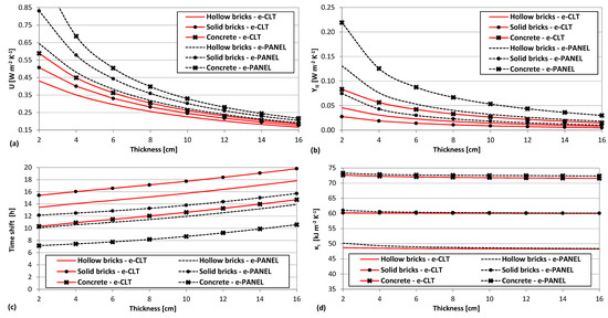 As far as the time shift is concerned (Figure 4c), once again the walls renovated with e-CLT perform the best. Excellent performance (ϕ > 12 h) calls for at least 8–10 cm of wooden fiber if e-CLT applies to concrete walls and even 12 cm when the e-PANEL adds to hollow bricks. It is also interesting to observe that the high time shift suggested in Spain [26] now implies non-negligible insulation thickness, which was not required if only looking at the U-value.
