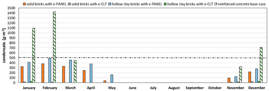 Hence, the hygrothermal performance of e-PANEL is worse than that of e-CLT: as an example, the amount of condensate predicted for hollow clay brick structures located in the coldest climate zone F under the indoor “vapor class production 4” is close to the normative limit of 500 g∙m−2 (see Figure 5). This can be attributed to the lower water vapor resistance of the walls renovated with e-PANEL, which ease the water vapor to move through and reach the coldest points of the walls, thus eventually condensing.