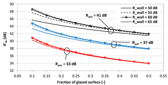 Now, the windows have usually a much lower sound reduction index than the walls, and the exponential structure of Equation (7) makes them able to severely undermine the acoustic performance of a façade, even if they are of relatively low surface area. In fact, let us consider Figure 6, which reports the solution of Equation (7) for three possible window performance levels, namely: