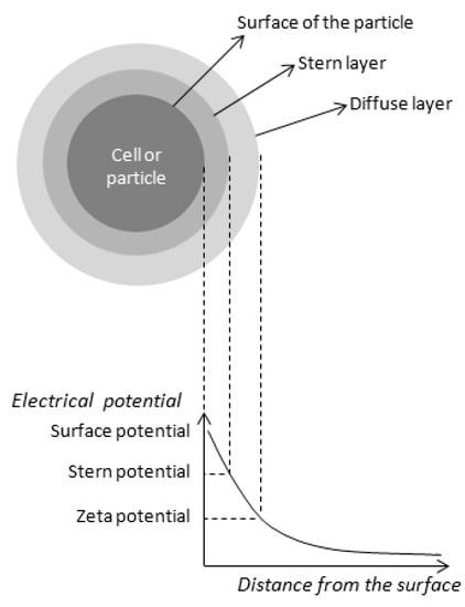 Particles in colloid suspensions are coated with an electrical double layer. This structure consists of two layers. The first (stern) layer surrounding a negatively charged cell is created by cations, which adhere to the particle strongly. In the second layer (diffuse), the concentration of ions decreases as the distance from the molecule increases (Figure 1). Hence, the force of the interaction with the opposite ion decreases and it can diffuse to the suspension. Finally, the charge equalizes with the environment. The potential on the outer side of the diffusion layer is called zeta potential (ζ). It determines repulsion between particles and sustains the dispersion of the suspension [110]. According to the DLVO theory, which explains the double layer compression, the total energy is the sum of the electrical double layer (repulsion) and Lifshitz-van der Waals energy (attraction). Attractive forces depend on the ionic strength of the suspension. When the suspension has high ionic strength, the thickness of the double layer is reduced. For aggregation to occur, the force of attraction must be higher than repulsion. This can be achieved by addition of Na+, K+, Ca2+, or Fe2+ cations to the suspension with low ionic strength [99,110]. This type of flocculation can occur, for example, as a consequence of mixing seawater with freshwater, which have high and low ionic strength, respectively [88]. In algal cells there are LB-EPS and TB-EPS, which may be considered as stern and diffuse layers [95].