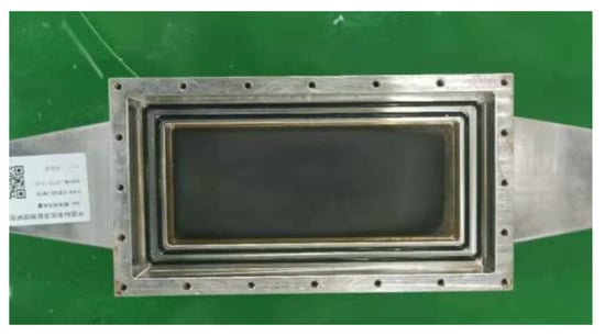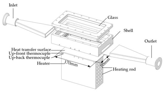 A thermal–hydraulic test loop was constructed to accommodate a high aspect ratio of a rectangular channel to simulate the coolant channel of the first target in the spallation target. A mini-channel heat sink with a height of 70 mm and a length of 170 mm was designed for providing the constant heat flux on the wall adjacent to the coolant. The aspect ratio and gap thickness of the test channel were 53.8:1 and 1.3 mm, respectively. As shown in Figure 2, the heat exchange channel was sealed by a glass cover plate and oxygen-free copper heater surface, which was made of 304 series stainless steel and hard sealing rubber ring. The heat exchange area on the surface of the mini-channel was 70 mm × 170 mm. The heater was made of oxygen-free copper, and 28 heating rods were packed inside. Each heating rod can provide a maximum power of 500 W, and the wall heat flux can reach the requirement of 0.9 MW/m2 for the mini-channel heat sink. The heater and test section were modeled using ANSYS Fluent 17.0 software to ensure a constant wall heat flux in order to predict the maximum temperature and thermal gradient. Fabrication tolerances were used to account for the anticipated thermal expansion of components at operating temperatures. Transition sections were cut using wire electrical discharge machining to form a smooth inlet and exit to the channel to reduce vortex shedding and the required hydrodynamic development length. In this paper, the surface roughness of the channel was carefully controlled to be smaller, compared to the thickness of the viscous sublayer to ignore the influence of the roughness, which is already shown in [23]. The 20 thermometers were divided into 4 groups, which included up–front, down–front, up–back, and up–down. Each group was distributed along the flow direction. The distance between front and back rows was 4 mm, and upgroup and down-group thermometers were symmetrically distributed. The thermocouples were inserted into the heater box at 5 mm depth, as shown in Figure 3.